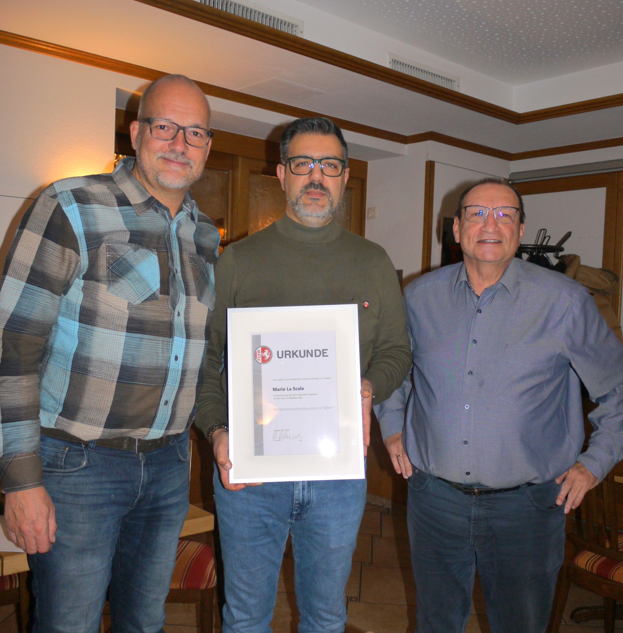 aufgrund deines großartigen ehrenamtlichen Engagements wirst du heute mit der Ehrennadel in Silber und der Ehrenurkunde des Fußball- und Leichtathletikverband Westfalen (FLVW) ausgezeichnet, unterzeichnet vom Präsidenten des Fußball- und Leichtathletik-Verbandes Westfalen (FLVW), Herrn Manfred Schnieders.